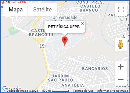 COMO CHEGAR: A sala do PET FÍSICA - UFPB esta localizada no Centro de Ciências Exatas e da Natureza - CCEN, proximo ao Departamento de Estatística, Matemática e Física.