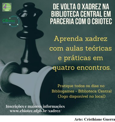 A Biblioteca Central da Universidade Federal da Paraíba (BC/UFPB) renovou a parceria com o Projeto de Extensão “Uso do jogo de Xadrez como ferramenta didática”, agora em sua terceira edição, do Centro de Biotecnologia (Cibiotec) da UFPB. Esse serviço tem como finalidade contribuir para a melhoria do desempenho acadêmico dos alunos participantes. As inscrições são gratuitas e já estão abertas.