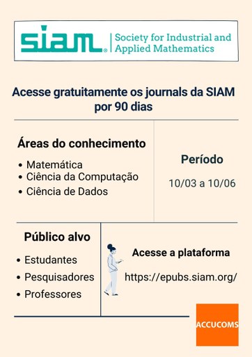 Biblioteca Central da Universidade Federal da Paraíba (BC/UFPB) está disponibilizando aos usuários o trial da base da Sociedade de Matemática Industrial e Aplicada‎ (SIAM) que abrange as áreas do conhecimento em Matemática, Computação e Ciência de Dados. Serão 90 dias de teste (de 10 de março a 10 de junho).
