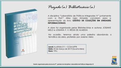 O evento é promovido pela turma do 9º período da disciplina Laboratório de Práticas Integradas IV, ministrada pela professora Alba Lígia Almeida, do Departamento de Ciência da Informação da UFPB. Mestre em Ciência da Informação e especialista em Gestão de Unidades de Informação pela UFPB, a Profª Alba Lígia também atuou na Biblioteca Central (BC/UFPB).