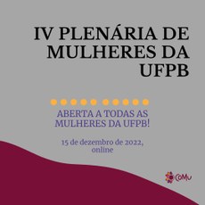 No próximo 15 de dezembro, será realizada a IV Plenária de Mulheres da UFPB, de maneira remota. A atividade é aberta a todas as mulheres que estudam e trabalham na UFPB, que podem se inscrever através de formulário disponibilizado pela Comissão organizadora do evento até 13 de dezembro.