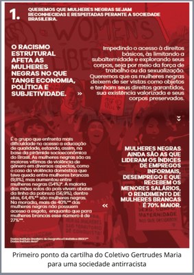 Em comemoração ao mês da mulher negra, latino-americana e caribenha, o Coletivo Gertrudes Maria lançou uma cartilha com dez pontos para uma sociedade antirracista que objetiva dialogar não só com a comunidade negra, mas com toda a sociedade. “A informação é a arma de combate a todas as opressões no contexto vigente”, conclui Ana Beatriz. A sociedade igualitária é uma urgência para as mulheres negras e ultrapassa o contexto de pandemia da Covid-19. A cartilha “10 pontos para uma sociedade antirracista” está disponível para download no link: As ações do coletivo também podem ser acompanhadas através do Instagram.