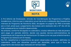 A Pró-reitoria de Graduação, através da Coordenação de Programas e Projetos Acadêmicos, informa que o calendário anual de envio e validação das frequências mensais do Programa de Monitoria 2025, divulgado na página da PRG e enviado por e-mail, prevê que o pagamento das bolsas será realizado até o 10º dia útil do mês subsequente ao trabalho desenvolvido.