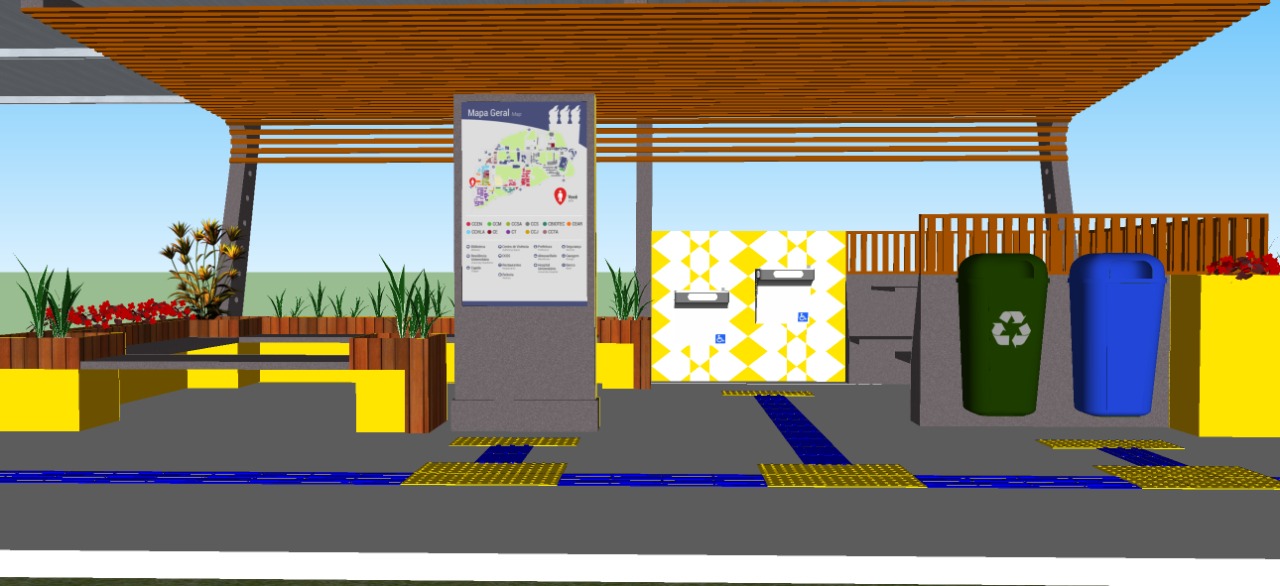 As rotas serão compostas por calçadas acessíveis, dotadas de piso tátil direcional e de alerta, garantindo orientação adequada para pessoas com deficiência visual. A maior parte do percurso contará com passarelas cobertas, permitindo que a comunidade universitária possa circular protegida do sol e da chuva, um elemento que garante maior conforto em deslocamentos diários longos dentro do campus. Toda a estrutura contará com iluminação adequada, possibilitando circulação segura também no período noturno.