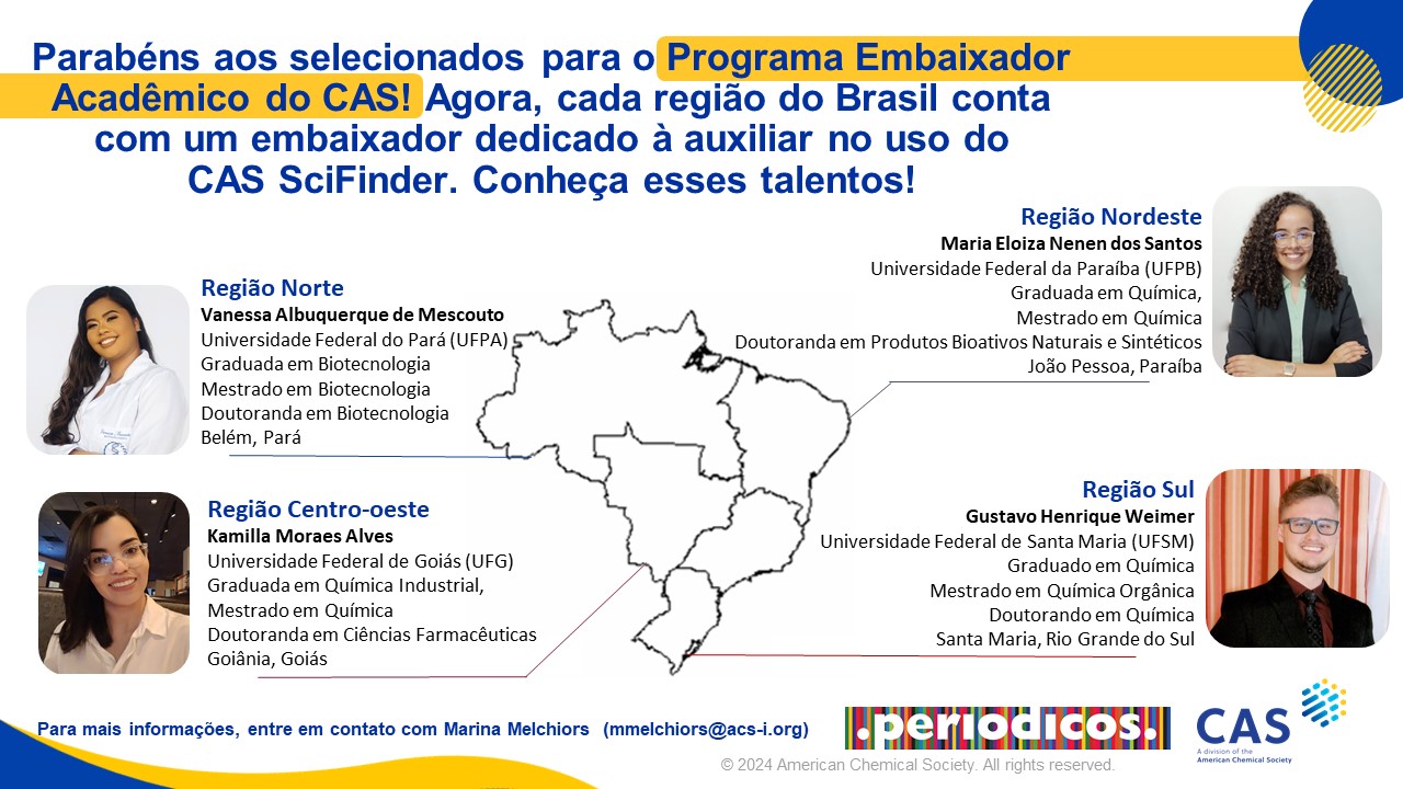O programa seleciona quatro pós-graduandos brasileiros — um de cada região do país — para representar o CAS em eventos acadêmicos e promover a conscientização sobre o uso da ferramenta CAS SciFinder. Além de atuar como porta-voz da marca, os embaixadores compartilham suas experiências com estudantes e professores de graduação e pós-graduação, incentivando o uso de recursos tecnológicos que apoiam a pesquisa científica.