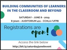 Como todas as ações do EFOPLI (DLEM/CCHLA/UFPB), o evento é gratuito para que o maior número possível de docentes possa participar. Haverá sorteios de brindes e emissão de certificados. A inscrição deverá ser feita pelo link: bit.ly/saturdayjune8event.