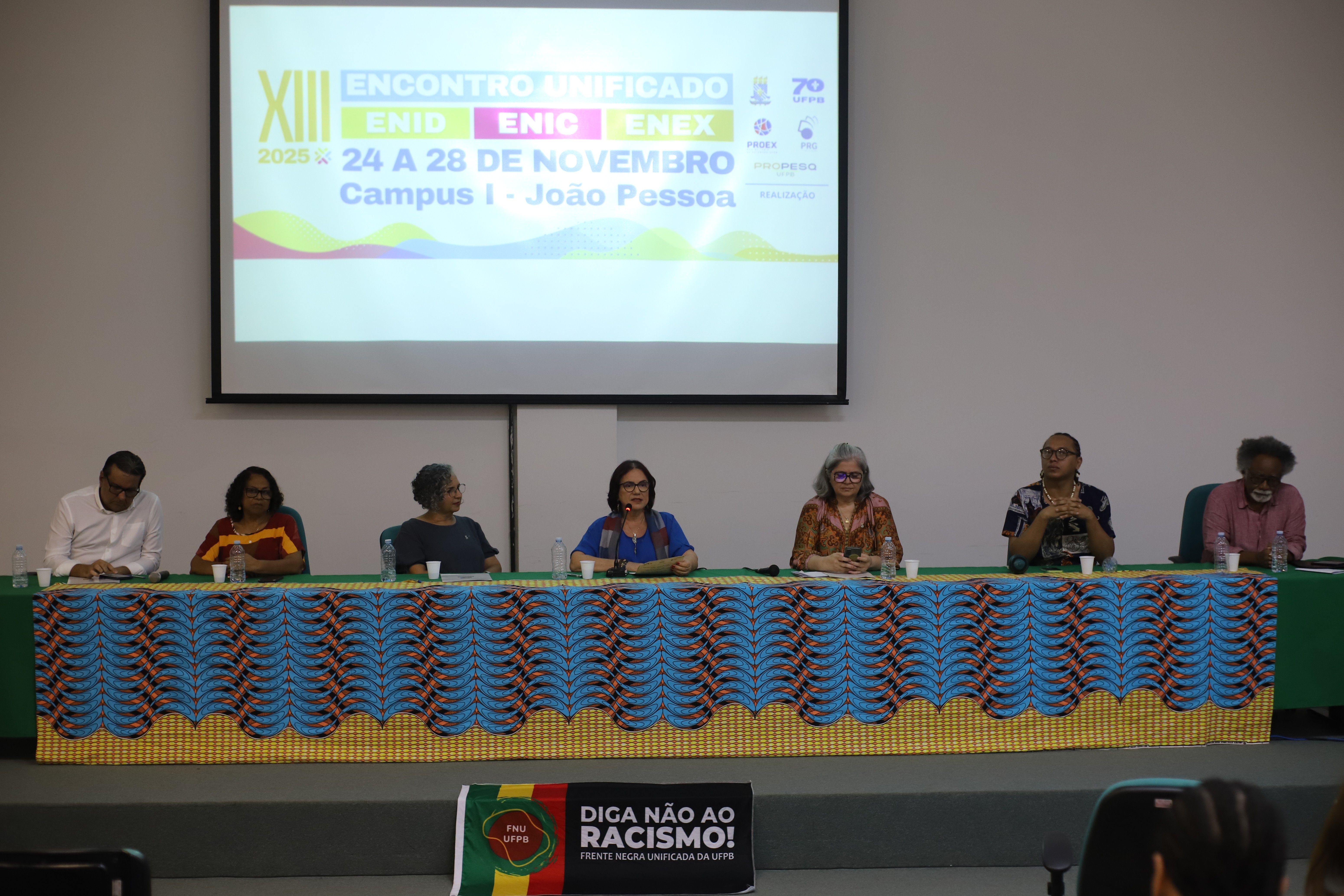 O momento de abertura destacou a temática do enfrentamento ao racismo, em alusão ao Dia da Consciência Negra, celebrado em 20 de novembro. Compuseram a mesa de abertura a Vice-Reitora Mônica Nóbrega, o discente Felipe Tavares, representando a Frente Negra Unificada da UFPB, a servidora técnico-administrativa Maria de Lourdes Batista, coordenadora de projeto de extensão sobre educação antirracista; o docente Antonio Baruty, presidente da Comissão Institucional de Heteroidentificação; a Pró-reitora de Graduação, Ana Cláudia Rodrigues, a Pró-reitora de Extensão, Bernardina Freire, e o docente Issac Medeiros, representando a Pró-reitoria de Pesquisa (Propesq).
