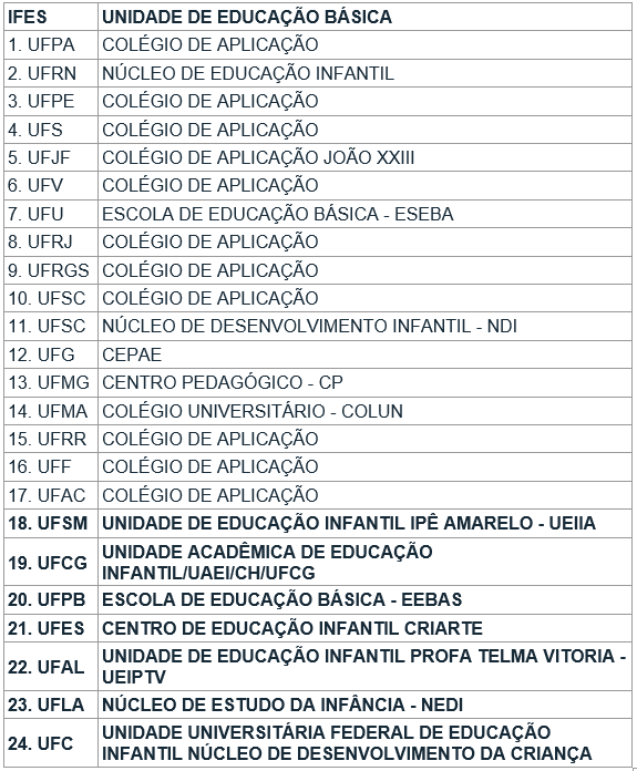 Na lista ao final desta reportagem é possível conferir os 17 Colégios de Aplicação existentes até então e, a partir do 18º, os novos sete Colégios de Aplicação aprovados, incluindo a EEBAS da UFPB. Na Paraíba, também obteve aprovação a Unidade Acadêmica de Educação Infantil (UAEI/CH) da Universidade Federal de Campina Grande (UFCG).