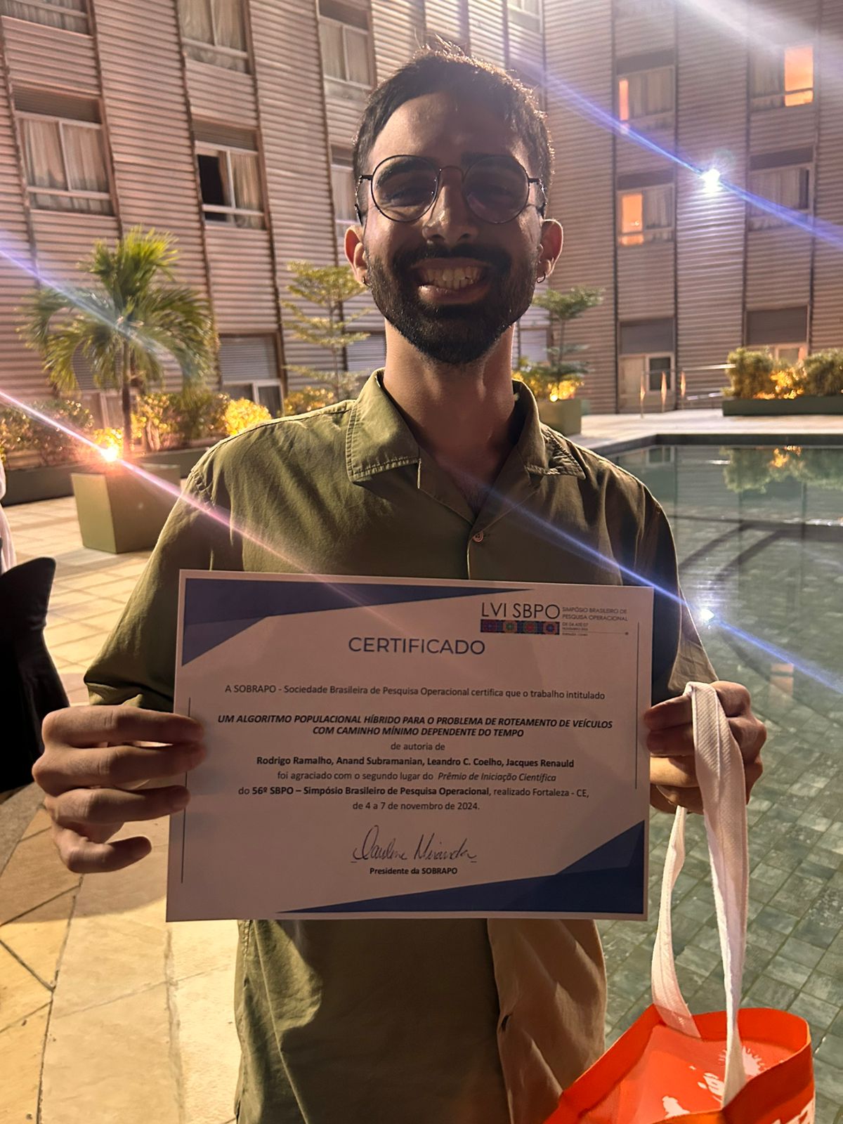 No âmbito nacional, a pesquisa intitulada “Um algoritmo populacional híbrido para o problema de roteamento de veículos com caminho mínimo dependente de tempo” obteve o segundo lugar no LVI (56°) Simpósio Brasileiro de Pesquisa Operacional (SBPO), promovido pela Sociedade Brasileira de Pesquisa Operacional (Sobrapo). O evento foi realizado entre os dias 5 e 8 de novembro, em Fortaleza.