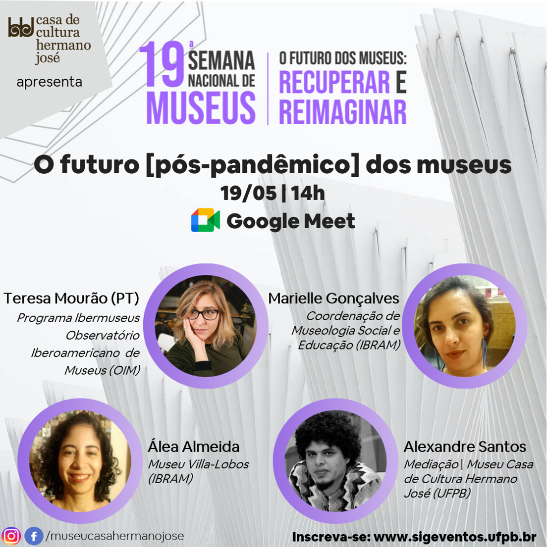 O Museu Casa de Cultura Hermano José (MCCHJ) da Universidade Federal da Paraíba (UFPB) realizará pela primeira vez a sua programação da 19ª Semana Nacional de Museus, evento organizado nacionalmente pelo Instituto Brasileiro de Museus (IBRAM). O evento ocorrerá nos dias 18 e 19 de maio, às 14h, de forma online, por meio da plataforma Google Meet. Este ano, traz como tema gerador “O futuro dos Museus: Recuperar e Reimaginar”. Para ter direito a certificado, os interessados devem se inscrever no Sistema Integrado de Gestão de Eventos (SIGEventos).