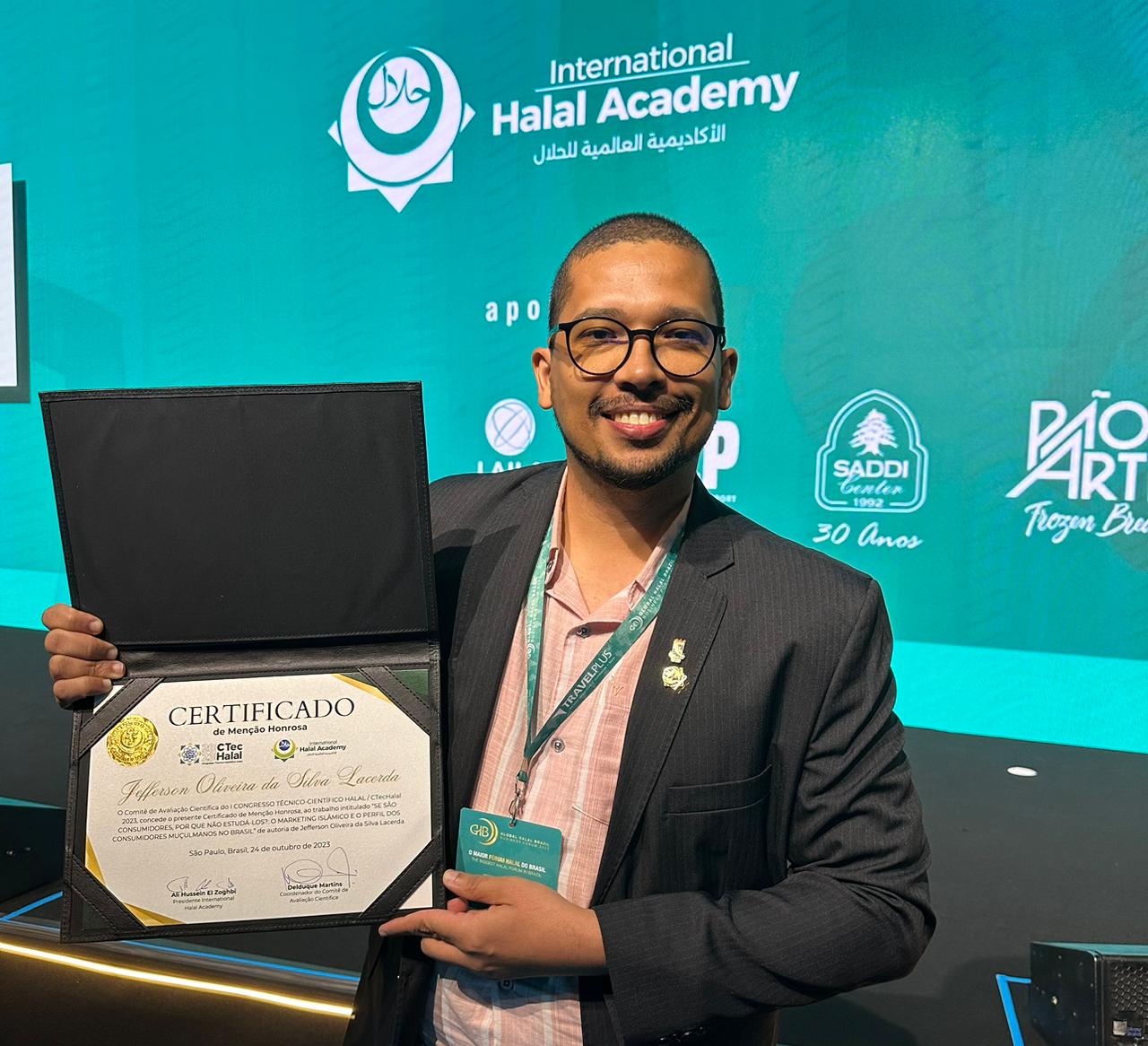 Um docente do Departamento de Turismo e Hotelaria do Centro de Comunicação, Turismo e Artes (CCTA) da Universidade Federal da Paraíba (UFPB), professor Jefferson Oliveira da Silva Lacerda, teve dois trabalhos selecionados para o Congresso Técnico-Científico Halal (CTecHalal), organizado pela International Halal Academy, sendo um premiado e o outro recebeu menção honrosa. O evento aconteceu nos dias 23 e 24 de outubro, no WTC Events Center, em São Paulo.