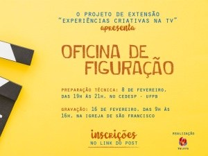 O projeto de extensão "Experiências Criativas na TV" vai realizar uma “Oficina de Figuração” nesta quinta-feira (8), para ator, estudante e até para quem já pensou em aparecer na TV, e será ministrada pelas diretoras de artes cênicas da TV UFPB Cely Farias e Valeska Picado.
