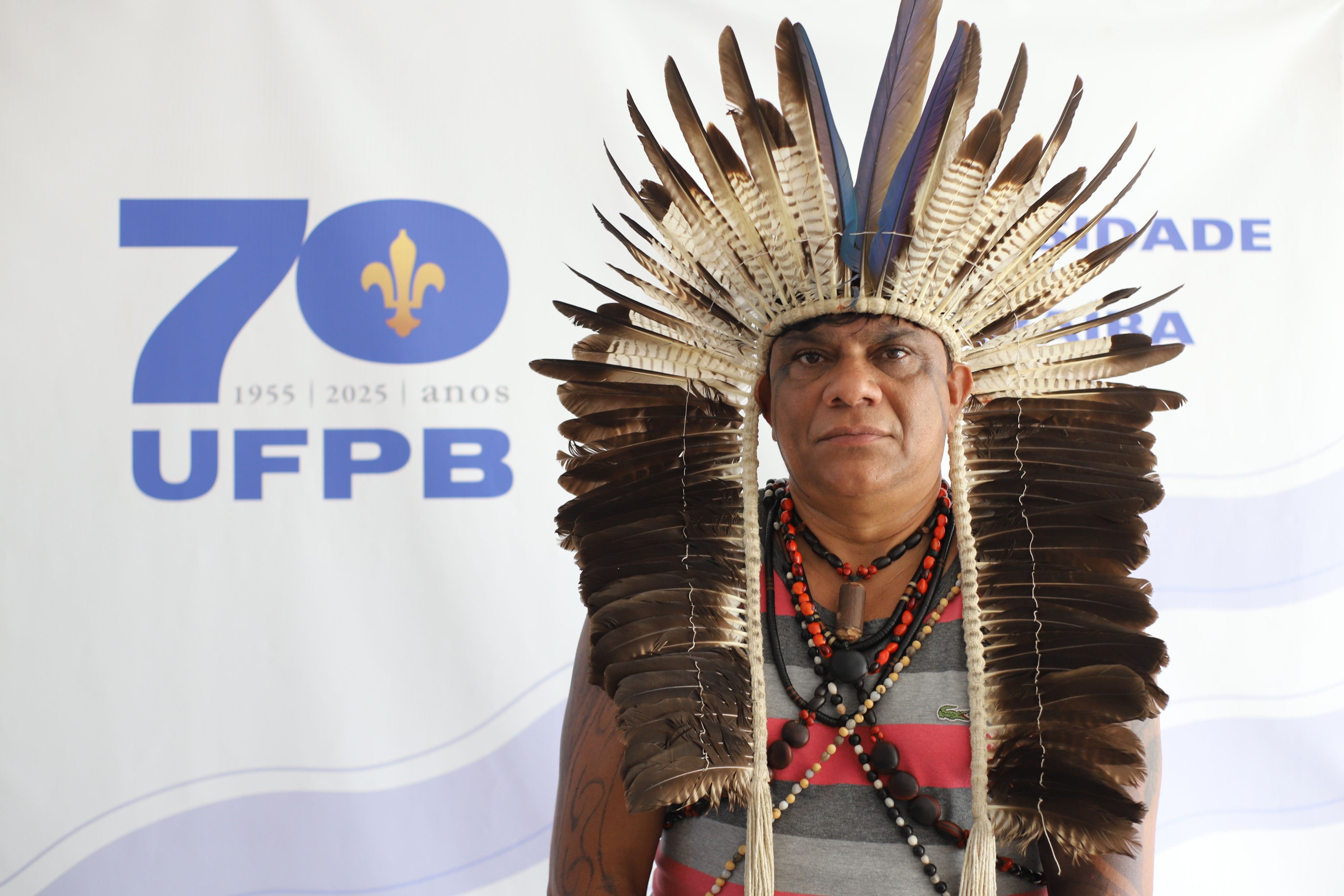 De cocar de penas e colares cruzados em “x” no peitoral, o professor da rede estadual e artista plástico Marcus Paranã fez questão de prestigiar o descerramento da placa de 70 anos da Universidade Federal da Paraíba (UFPB), na última segunda-feira (29). A atividade acontecia no campus IV, dividido entre as cidades de Mamanguape e Rio Tinto, e foi um dos vários eventos que marcaram a celebração do septuagésimo aniversário da instituição. “É muito perceptível como a região mudou após a chegada da UFPB”, atesta Paranã, que é membro do povo indígena Potiguara, habitante da região do vale do Mamanguape. “Há um acolhimento por parte da universidade com os nossos estudantes, reconhecendo as especificidades deles”.