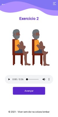 Ao término desse passo a passo, o usuário idoso iniciará a sequência de exercícios que contém compressas, relaxamento utilizando a música associada ao padrão respiratório ideal e orientações posturais diversas, mediante sua necessidade naquele momento para aliviar o desconforto na coluna lombar.