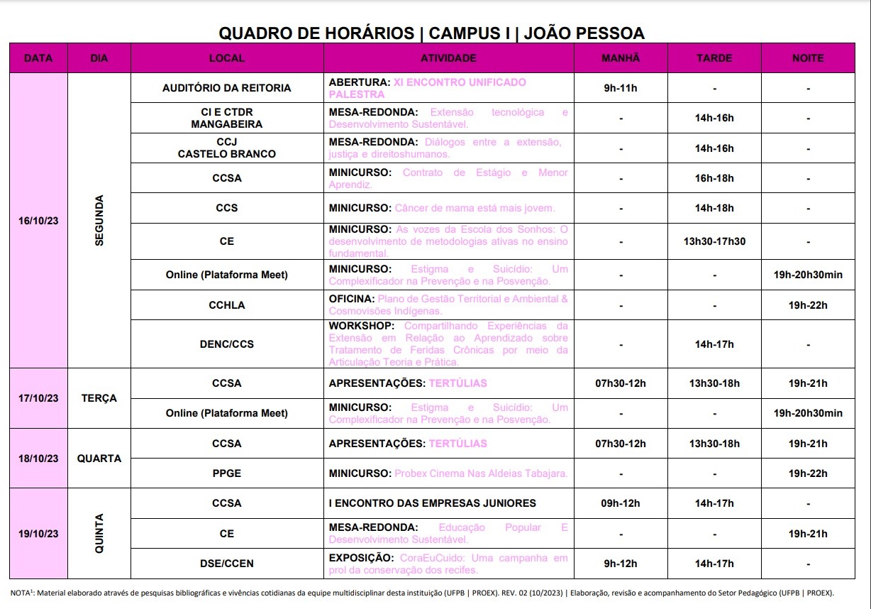 Veja a programação completa do Campus I na página do Enid, no site da PRG, na qual está disponível também a distribuição das apresentações dos trabalhos e das mesas redondas, bem como dos avaliadores dos trabalhos neste mesmo campus. A programação para os demais campi ainda está sendo fechada e será divulgada no mesmo canal.